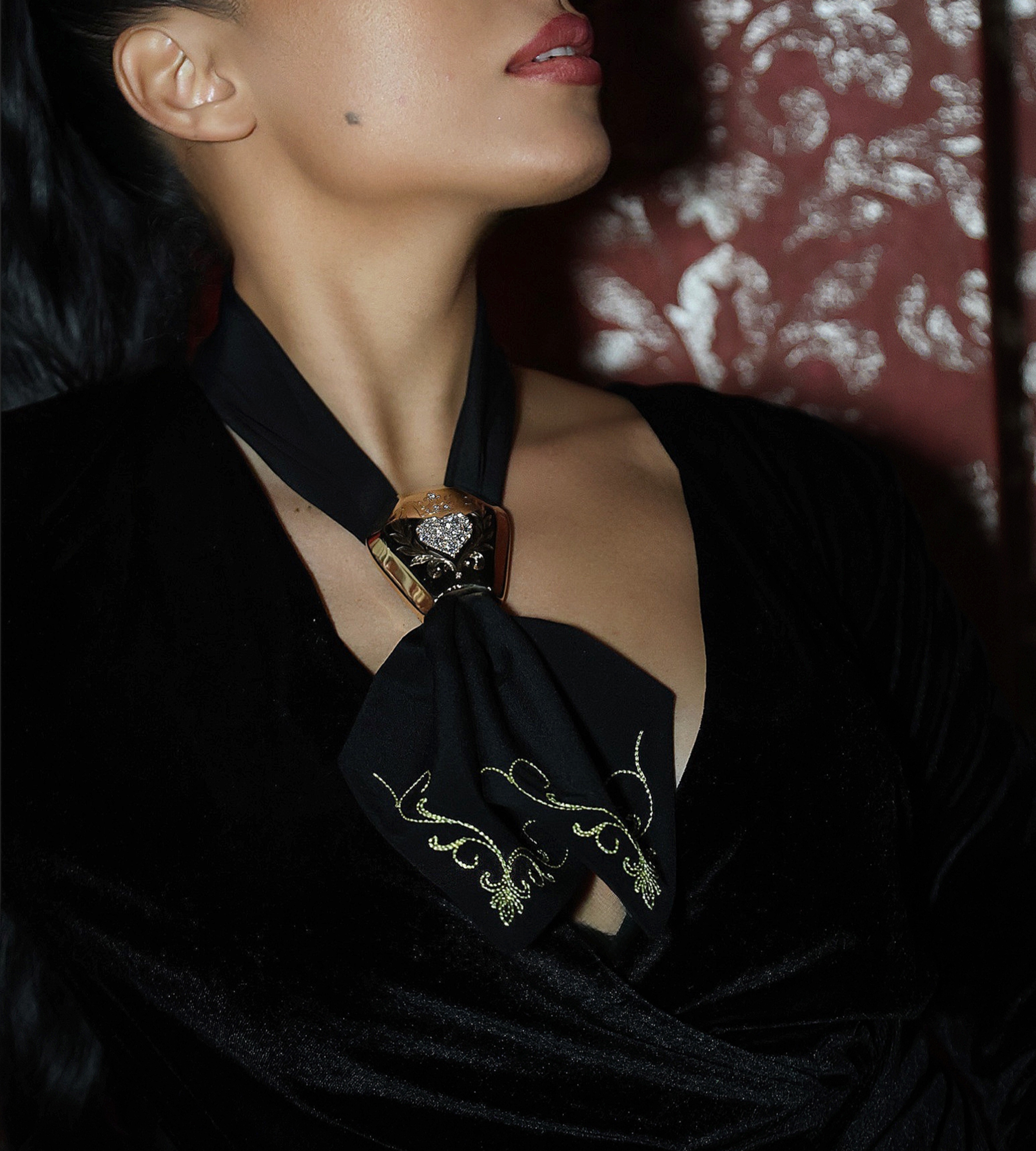 • Metals & balance — proportions designed to sit naturally at the neckline: refined, never loud.